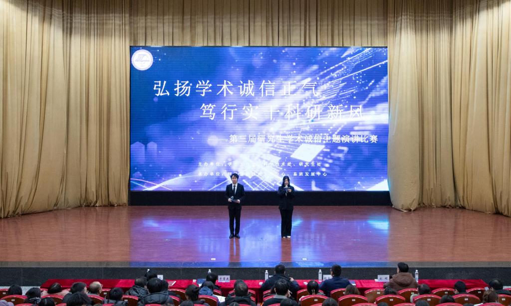 为引导广大研究生弘扬学术道德、遵守学术规范、恪守学术诚信、维护学术尊严、端正学术风气,营造良好的学术氛围,12月25日,“弘扬学术诚信正气,笃行实干科研新风”第三届研究生学术诚信主题演讲比赛决赛在图书馆报告厅举行。校团委、研究生处、教务处、科技处、学生工作处负责人,各学院副书记、副院长、研究生辅导员以及研究生代表参加了本次比赛。