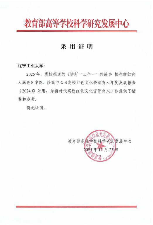 近日,我校申报的红色文化育人典型案例《讲好“三个一”的故事 擦亮鲜红育人底色》,成功入选教育部高等学校科学研究发展中心《高校红色文化资源育人年度发展报告(2024)》,为新时代高校红色文化资源育人工作提供了辽工大实践方案。