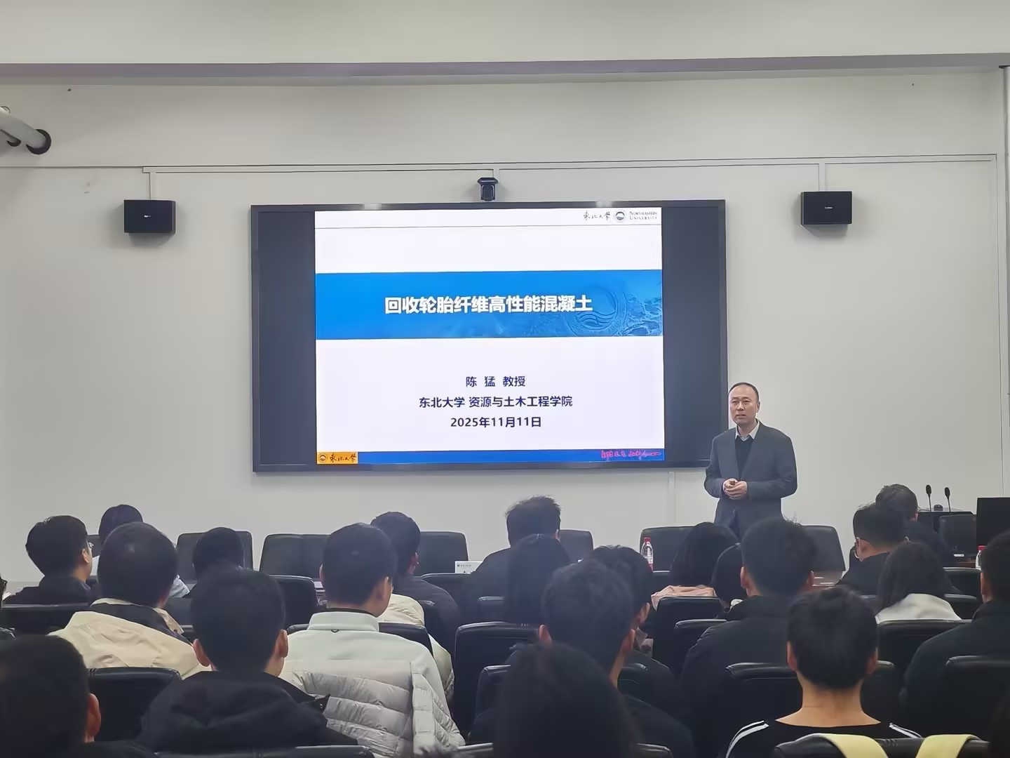 东北大学陈猛教授,博士生导师、土木工程系主任,辽宁省普通高等学校本科教学名师,沈阳市领军人才,专注固废资源化与高性能混凝土研究。他以“回收轮胎纤维混凝土”为题作学术报告。报告聚焦回收轮胎纤维混凝土,阐述其对固废资源化与可持续结构体系的重要意义,介绍了制备技术及纤维对混凝土性能的影响,为绿色发展提供了新思路。(赵丽红 文/姚骄芮 摄影)